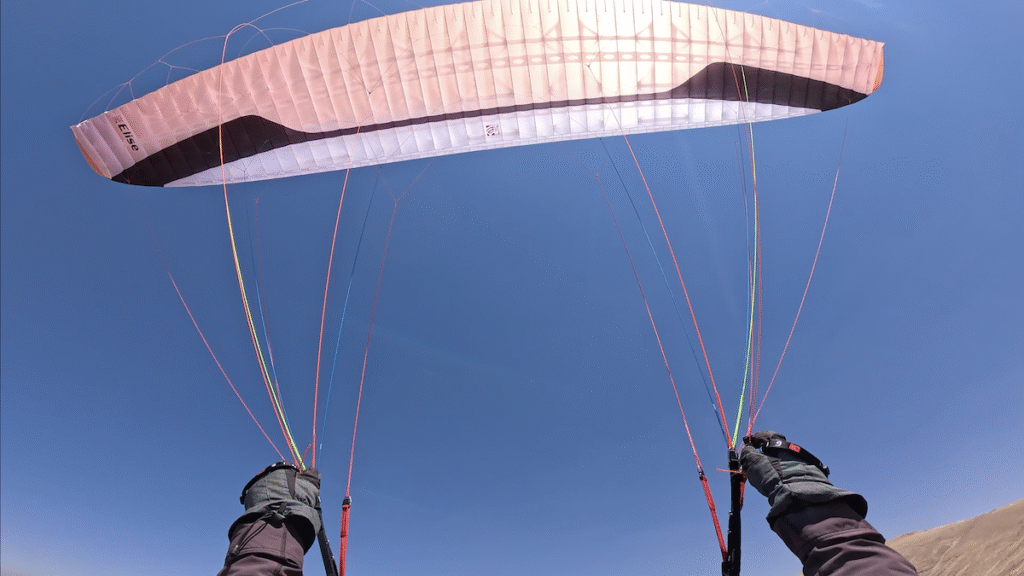Actually, what kept me satisfied is the handling and the brake authority! I never thought that one day an A-class glider could give me the satisfaction of steering abilities! Elise did it! The brake travel when turning is around 25 cm in all conditions, but you can lower your brakes a bit more without any issues. It’s forgiving, yet playful. The brakes have moderate pressure and are pretty responsive, enabling quick and tight turns.